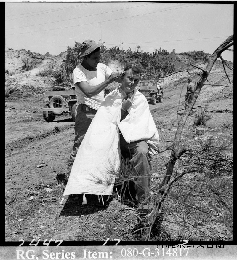 【和訳】 ガリソン2等兵の髪を切ってあげるラモス1等兵。沖縄にて。