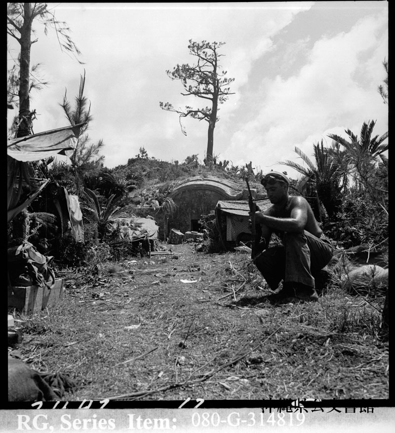 【和訳】 カービン銃を持ったメッシング伍長。沖縄の墓の前に設けた野営地の前にて。