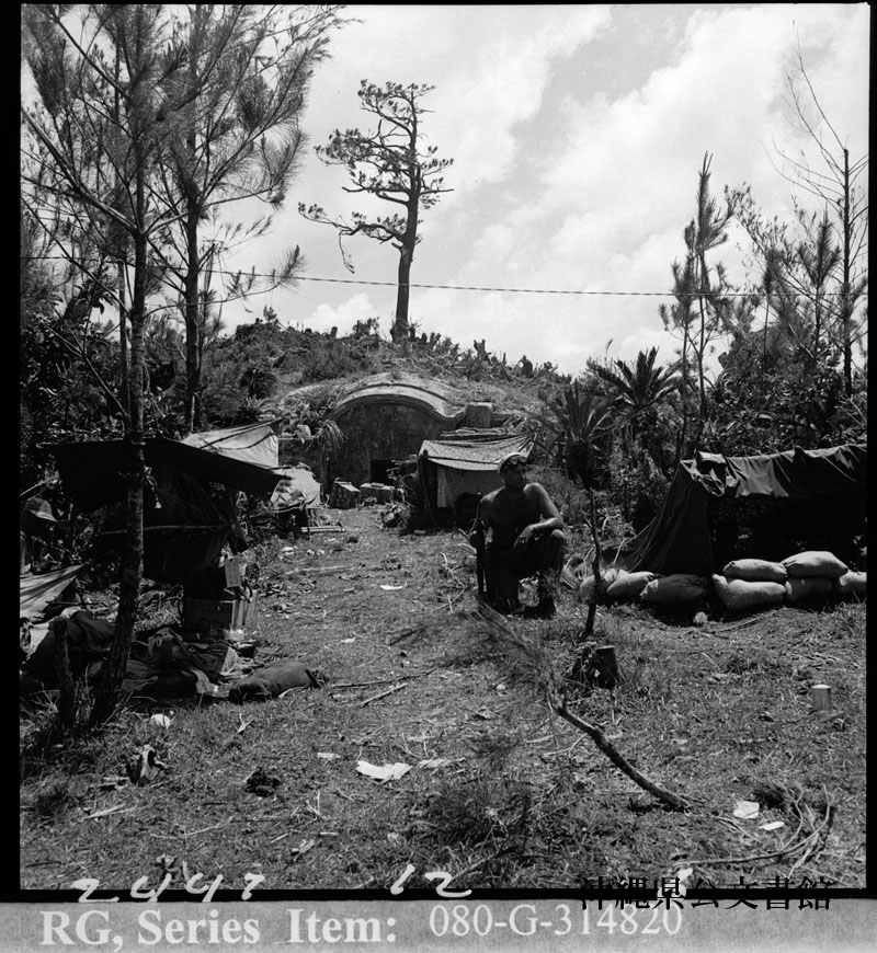 【和訳】 カービン銃を持ったメッシング伍長。沖縄の墓の前に設けた野営地の前にて。