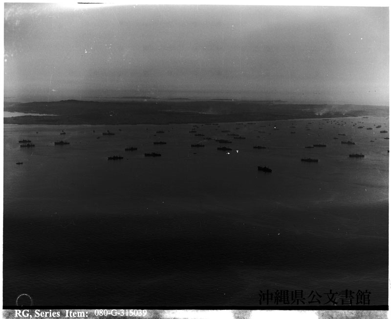 【和訳】 艦隊の空中写真。沖縄近海にて。