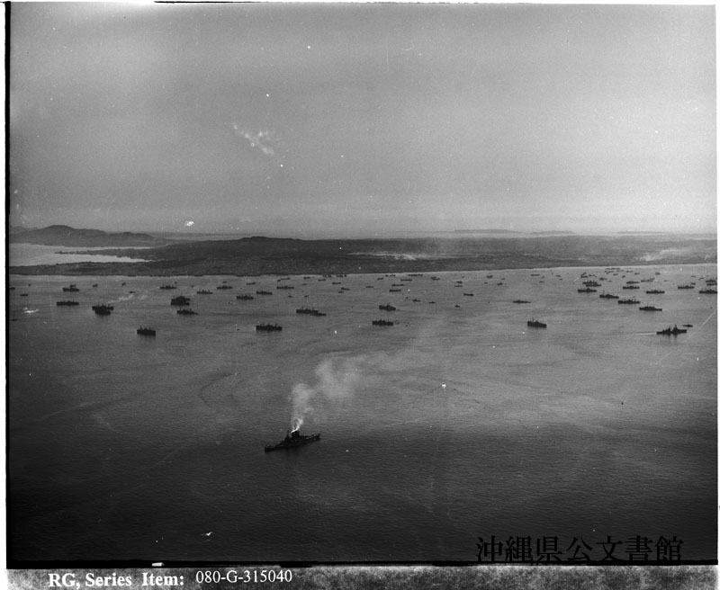 【和訳】 艦隊の空中写真。沖縄近海にて。