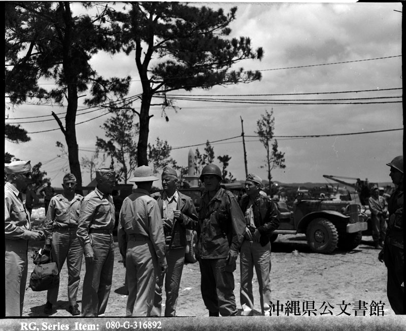 【和訳】 沖縄視察中の米海軍ニミッツ元帥と高官。