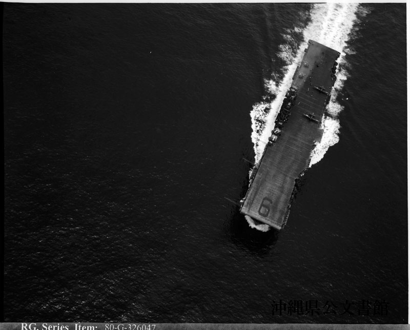 【和訳】 沖縄上陸作戦遂行中の空母エセックス (CV-9)。