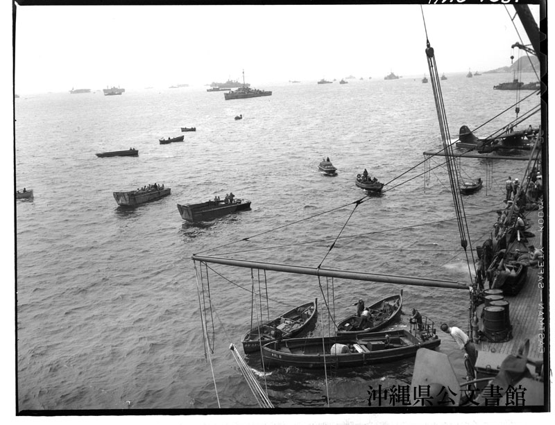 【和訳】 ボートと揚陸艇。水上機母艦チャンドラー(AV-10)右舷の船梁から降ろされる郵便物を待つ様子。慶良間列島にて。