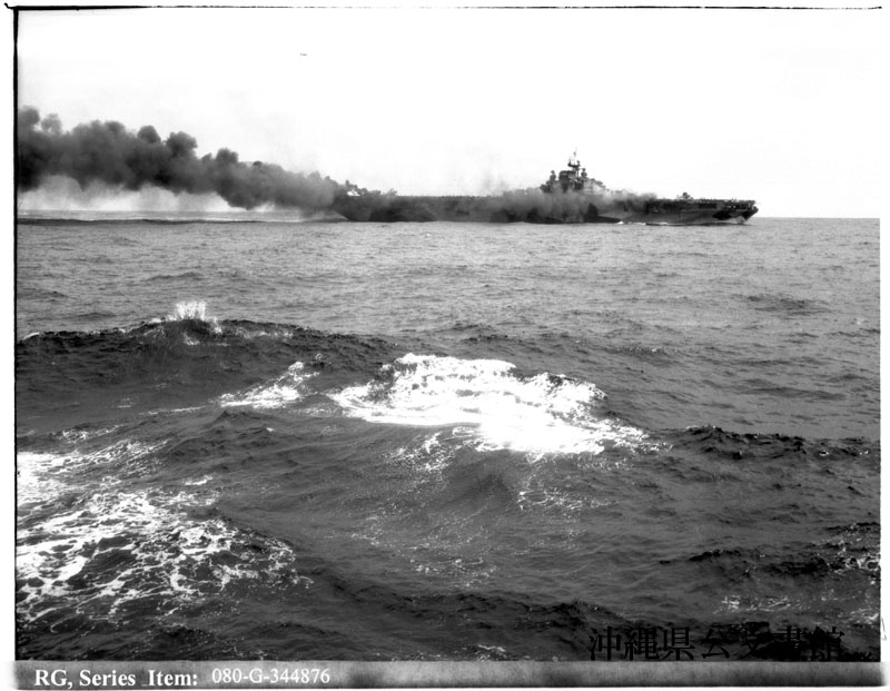 【和訳】 沖縄侵攻作戦中に、日本軍特攻機による直撃を受けた空母ハンコック(CV-19)。軽巡洋艦パサデナ(CL-65)から撮影。