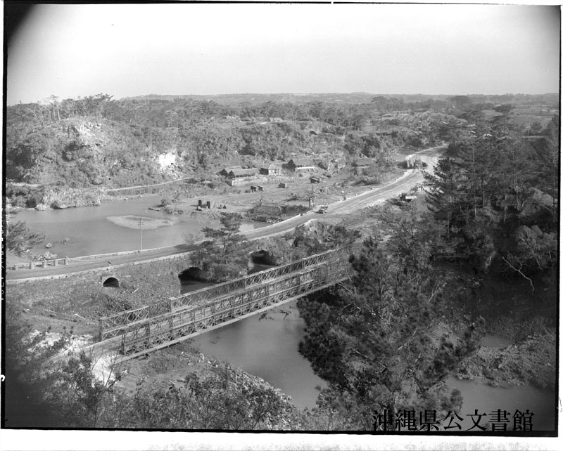 【和訳】 写真左下と右上には、日本の古い橋が見える。それらと並列して架かっているのは、建設大隊が新たに建設したベーリー橋。比謝近くにて。この橋は、南部戦線で苦戦している陸軍に二車線道路を提供するために、きわめて短い期間に建設された。