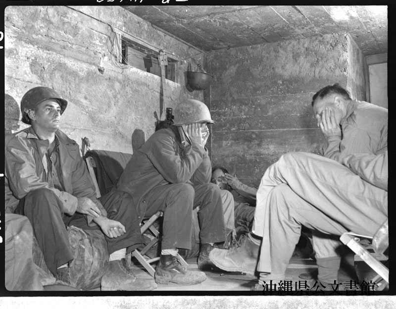 【和訳】 沖縄にいる海軍士官。彼らは日本軍が必死に読谷飛行場への攻撃を続ける中 、ほぼ毎晩を塹壕で過ごした。