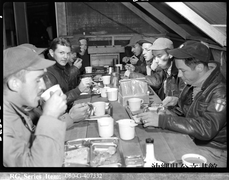 【和訳】 早朝に朝食を取る第1航空団のパイロット。読谷にて。彼らはこの後、索敵・爆撃パトロールのために出発する。