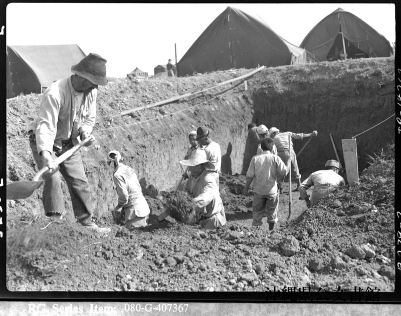 【和訳】 自発的に塹壕堀りの手助けを行う、親米的な地元民。読谷にて。彼らのほとんどは、日本軍に対して敵意を抱いている。