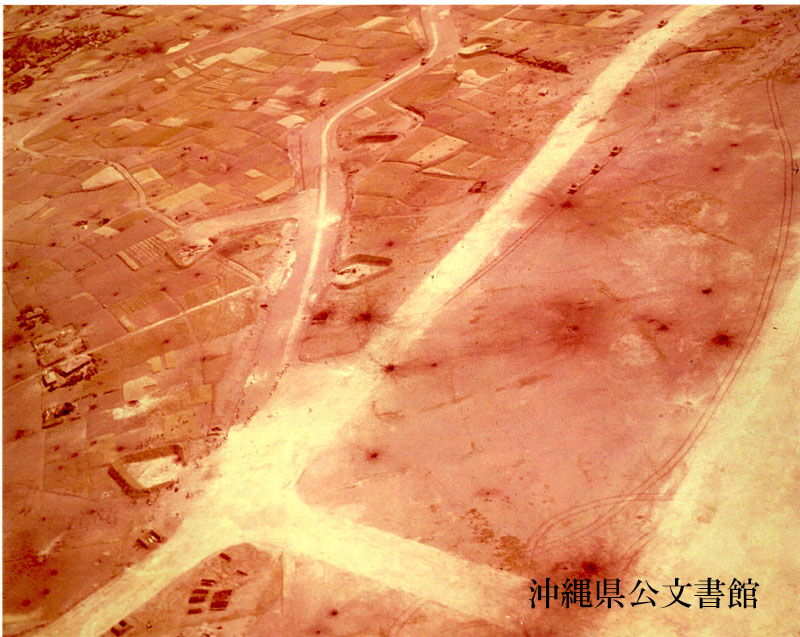 【和訳】 上陸日の読谷飛行場の様子。地上では陸軍の戦車が配置についている。米軍艦マキン・アイランド(CVE-93)から撮影。