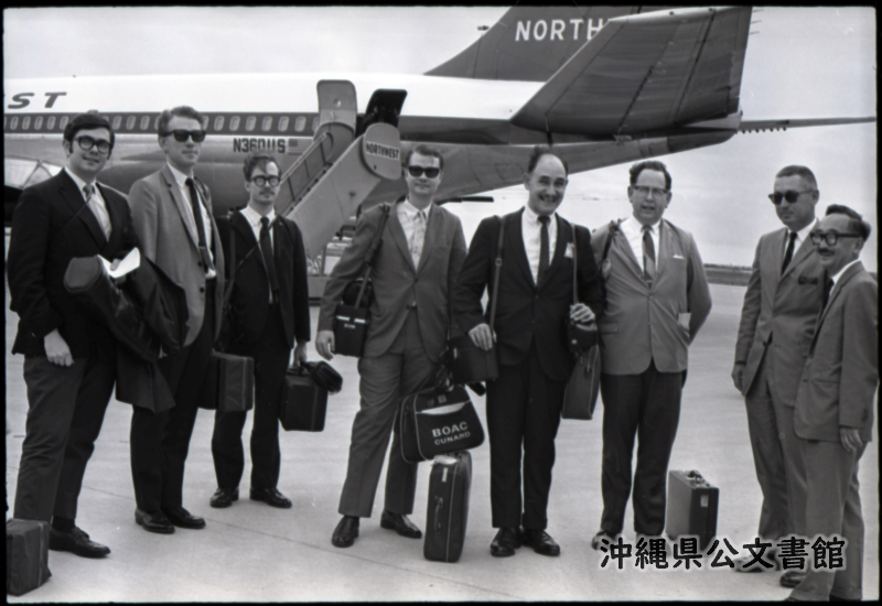 THE AMERICAN BRASS QUINTET, one of America's leading chamber music ensembles arrived here April 18 for two performances; one at the Okinawa Times Hall starting at 6 p.m., April' 19 and at the Kubasaki High School Auditorium starting at 7:30 p.m., April 20 and a workshop for brass instrumentalists at the Naha Ryukyuan-American Cultural Center. The visit to Okinawa was made possible by a recent change in the quintet's heavy schedule--of which the U. S. Civil Administration of the Ryukyus (USCAR) and the Okinawa Brass Musicians Association quickly took advantage to bring the group to Okinawa. The quintet's tour of the Far East and Pacific is sponsored by the U.S. Department of State under its cultural presentation program. Shown at the Naha Civil Air Terminal after arrival are (L-R) Gerald Schwarz, trumpet; Robert Biddlecome, bass trombone; John Eckert, trumpet; Edward Birdwell, French horn; Arnold Fromme, tenor trombone; and James McFarland, an escort officer of the quintet. Welcoming the group are (at right) Maj. Thomas D. Watkins, community relations officer; and Samuel N. Mukaida, chief, Cultural Affairs Div., both of the Public Affairs Dept., USCAR. 【和訳】アメリカン・ブラス・クインテッド(アメリカ金管五重奏団) アメリカを代表する室内アンサンブルのひとつ、アメリカン・ブラス・クインテットが2回の公演を行うため、 4月18日に来沖した。公演は沖縄タイムスホールで4月19日午後6時から、クバサキ・ハイスクールで20日午後7時30分から開催され、那覇琉米文化会館では金管楽器奏者を対象としたワークショップも行われる。クインテットの過密な演奏日程に最近変更が生じたことから、USCARと沖縄金管奏者協会はその機会を逃さず、迅速に来沖の実現へとつなげた。クインテットの極東・太平洋地域ツアーは、米国務省の文化交流プログラムの一環として行われている。写真は、4月18日那覇空港に到着したメンバーたち。左からトランペットのジェラルド・シュワルツ、バストロンボーンのロバート・ビドルカム、トランペットのジョン・エッカート、フレンチホルンのエドワード・バードウェル、テナートロンボーンのアーノルド・フロム、そしてクインテット随行担当のジェームズ・マクファーランド。出迎えるのは(右)USCAR広報局地域関係担当官トーマス・D・ワトキンス少佐(地域渉外担当官)とサミュエル・N・ムカイダ文化課長。