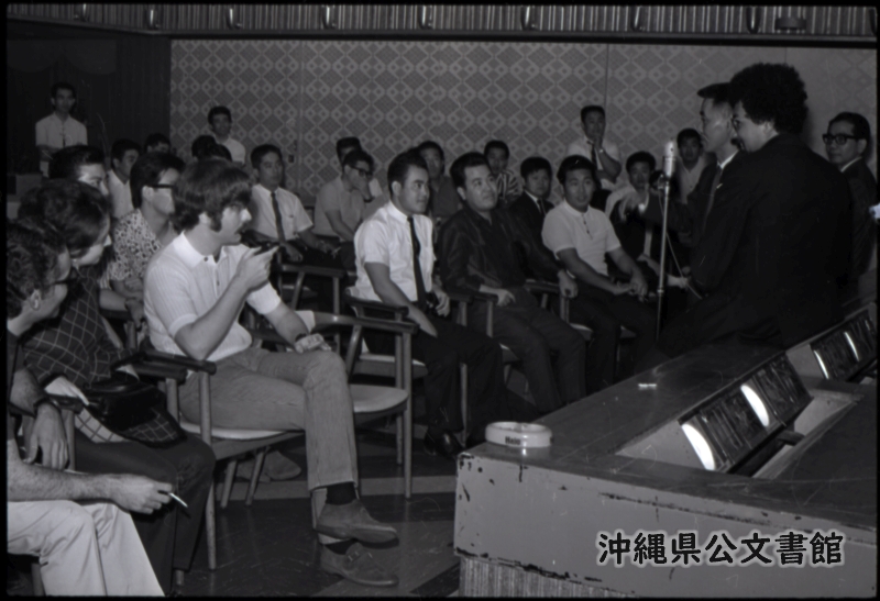 JAZZ WORKSHOP -- Charles Lloyd (R), composer, tenor saxophonist and flutist, leader of the outstanding Charles Lloyd Quartet, discusses jazz with Ryukyuan musicians at a jazz workshop at the Ryukyu Tokyu Hotel in Naha May 18. Other members of the quartet are (seated at left side, L-R) Paul Motian, drums; Jane Getz, piano; and Ron McClure, string bass. Second from right is Tadao Tokashiki, well-known Ryukyuan jazz critic. The quartet won the admiration of Ryukyuan jazz audiences during its three performances in Okinawa. The quartet is on a tour of Asian cities under the auspices of the U.S. State Department's Cultural Presentations Program. Public Affairs Department, U.S. Civil Administration of the Ryukyus, coordinated local arrangements with the Okinawa Times and Okinawa Musicians Association. 【和訳】チャールズ・ロイドによるジャズ・ワークショップ 作曲家でテナーサックス、フルート奏者として知られ、著名な チャールズ・ロイド・カルテット を率いる チャールズ・ロイド(右) が5月18日、那覇の琉球東急ホテルで開かれたジャズ・ワークショップで琉球のミュージシャンたちとジャズについて語り合った。カルテットのメンバーは他に(着席している左から)ポール・モティアン(ドラム)、ジェーン・ゲッツ(ピアノ)、ロン・マクルーア(コントラバス)。右から2人目は、琉球のジャズ評論家として知られる渡嘉敷唯夫。同カルテットは沖縄で3回の公演を行い、琉球のジャズ愛好家から賞賛を集めた。同カルテットは米国務省文化交流プログラムの後援で、アジアの各都市をツアー中。USCAR広報局が沖縄タイムス社と沖縄音楽家協会と連携し、現地での手配を行った。