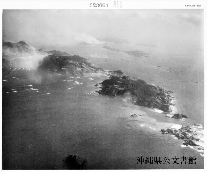 【和訳】 慶良間上陸作戦の航空写真。米艦船マキン・アイランド号より発進した航空機より撮影